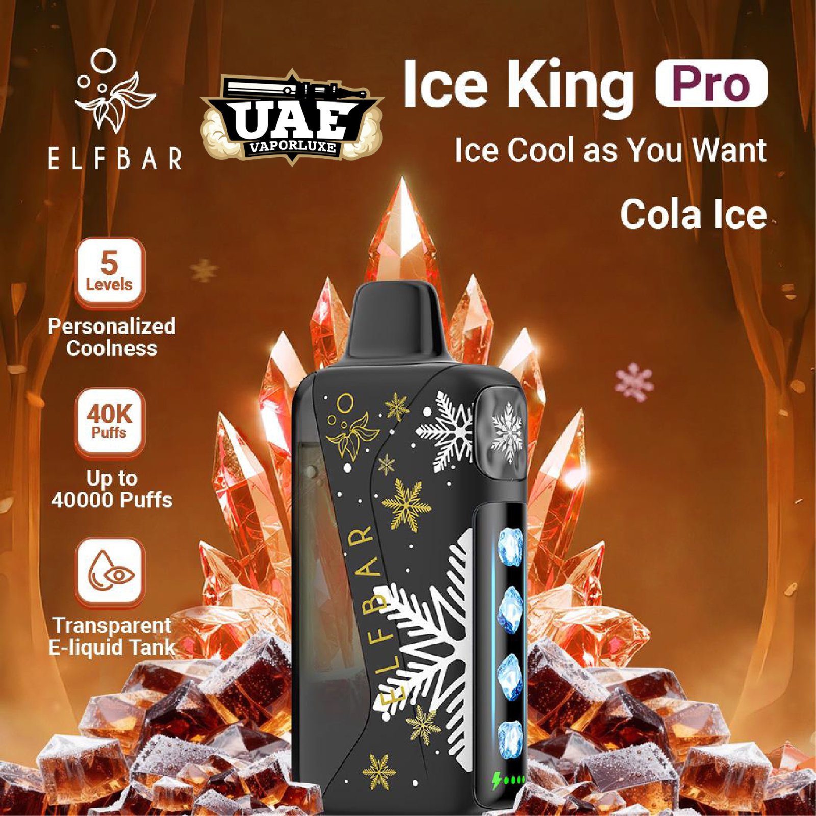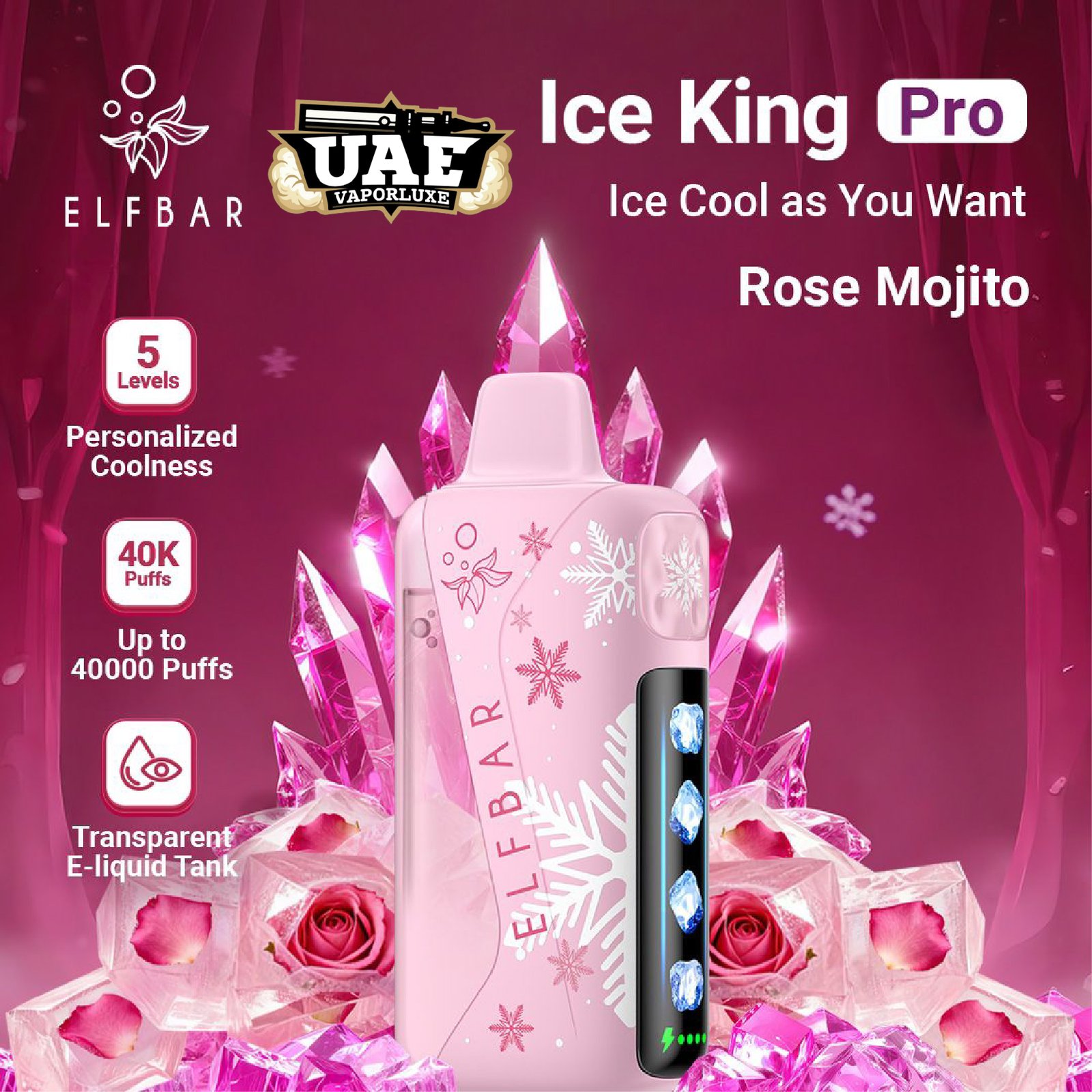 Elf Bar Ice King Pro 40,000 Puffs Disposable Vape, engineered for marathon sessions delivering up to 40,000 puffs via its high-capacity pre-filled e-liquid and 850-1000 mAh rechargeable battery. Featuring quad mesh coils for intense flavor, a smart LED display, an adjustable airflow slider, and 5-level ice control for customizable chill—from mild frost to arctic blast—this 50mg nicotine salt powerhouse suits UAE vapers craving smooth MTL draws without constant refills. Grab yours at uaevaporluxe for unbeatable endurance and refreshment.