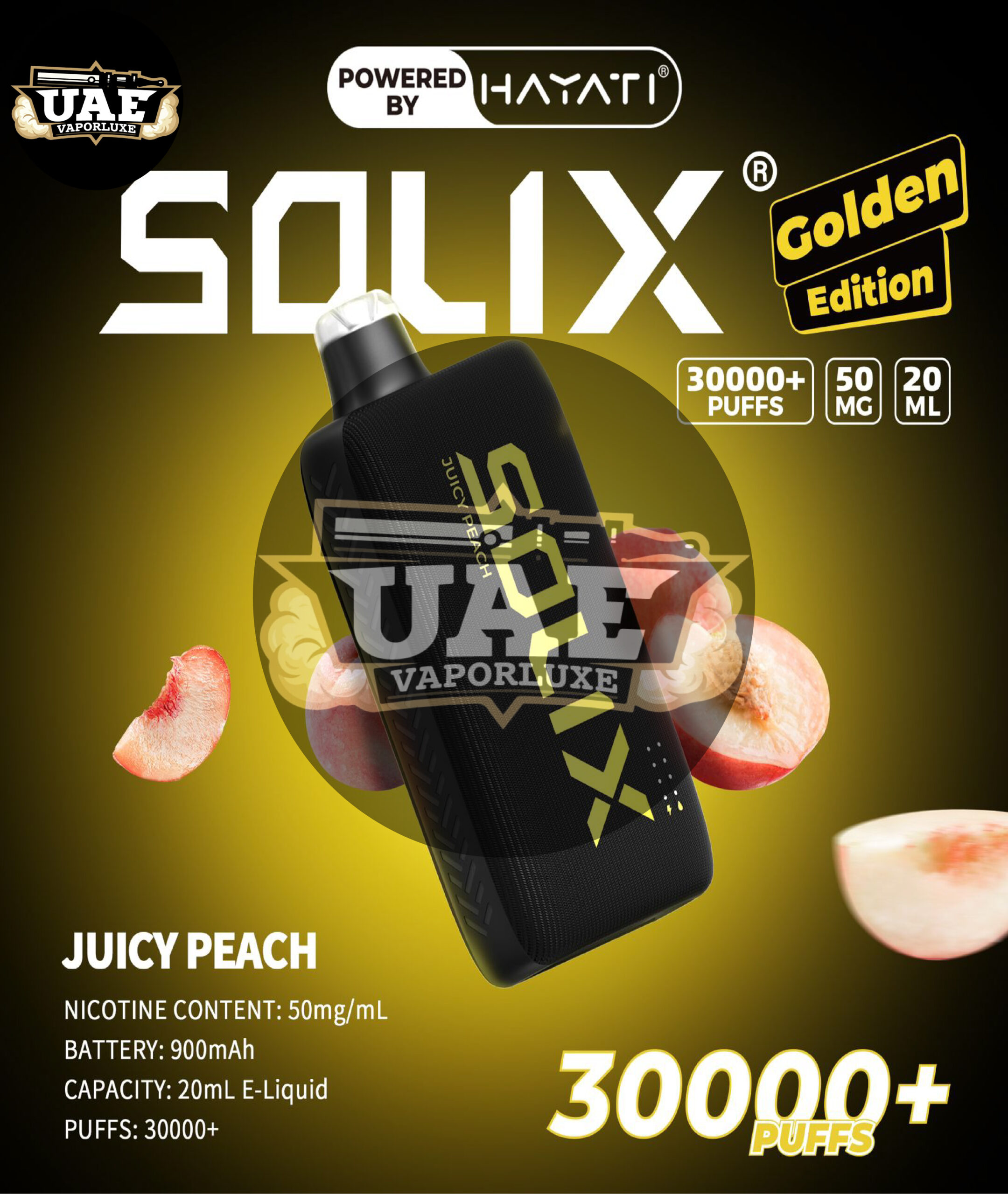 The Hayati Solix 30000 Puffs Disposable Vape Golden Edition in UAE – Dubai UAE is available for just 45 AED, offering exceptional value for a premium, long‑lasting vape. With fast delivery across Dubai, Sharjah, and Ajman, you can enjoy luxury vaping without delay.